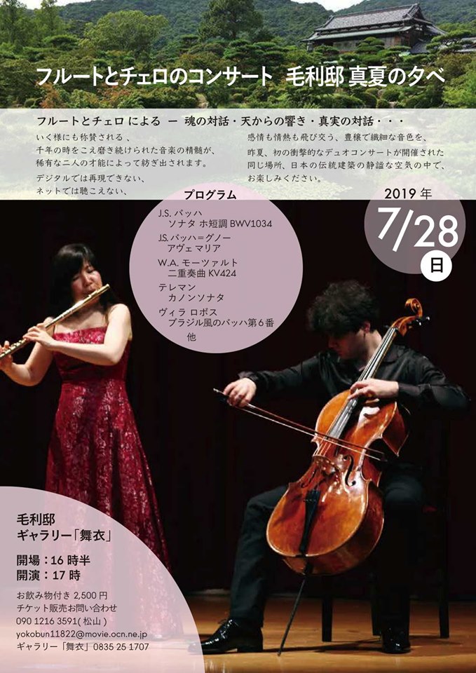 7月28日(日)山口 17時 防府市毛利邸博物館 フルート:古賀敦子 チェロ:ゲオルギー・ロマコフ TEL:ギャラリー「舞衣」0835 251707 (松山)090 1216 3591 Mail:yokobun11822@movie.ocn.ne.jp