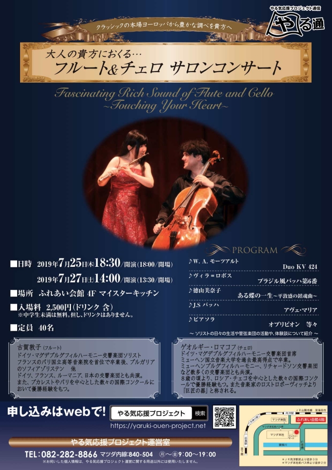 7月25日(木)広島 19時 ふれあい会館4階*マツダ本社横 フルート:古賀敦子 チェロ:ゲオルギー・ロマコフ https://yaruki-ouen-project.net TEL: 082 282 8866(マツダ内線 840 504)